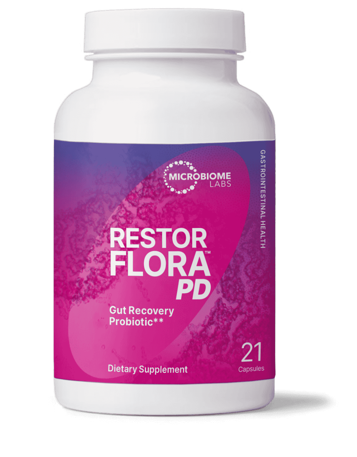 RestorFlora™ PD is a gut recovery probiotic that may help patients maintain a healthy gut microbial composition during and after taking microbial disrupting medications. RestorFlora™ PD contains probiotics that maintain potency in the presence of certain medications that may disrupt the microbial enviornment, while simultaneously supporting functional wellness.
