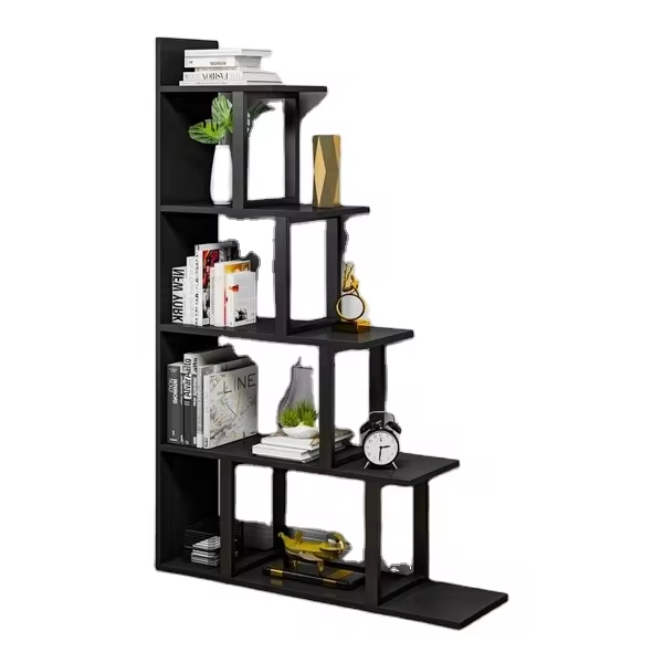 The Freestanding Ladder Etagere Bookcase combines modern style with practical design, resembling an open staircase extending outward from a solid back. This unique structure provides ample space for displaying books and decor, adding a sleek and sophisticated look to any room. Made from high-quality materials, it ensures durability and stability. Its airy, open feel makes it a stylish and functional addition to any living space.