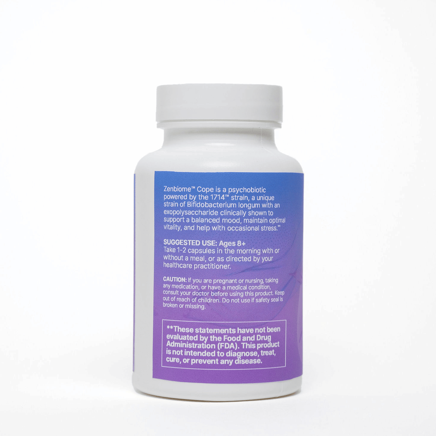 Designed to help clients better handle life’s occasional stressors. Zenbiome™ COPE pairs the well-researched psychobiotic 1714™ with other vital nutrients like B vitamins and herbal extracts to provide targeted support for coping with day-to-day stressors and mood changes.